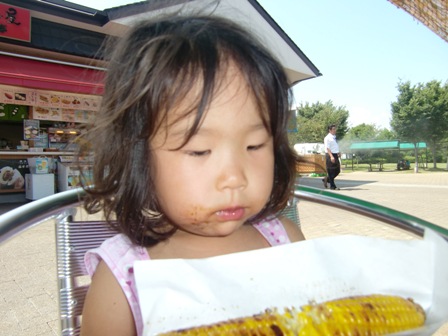 途中のSAで休憩。焼きトウモロコシを1本かぶりつきました…。すごい顔…。