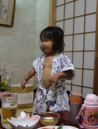 旅館の浴衣がはだけ、ぽんぽこりんおなかがぺロり。メタボおやじのようです…汗