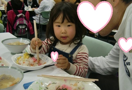 栄養士さんや先生が作ってくださったけんちん汁とちらしずしのお昼。どれもおいしかったです。
