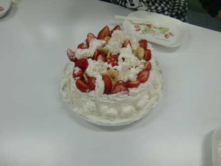 テーブルごとにケーキを作りました。中学生1人と小学生が3人のテーブルのところにお手伝いとして参加。生クリームをぬってるところ。一人10秒ずつみんなで泡立てました。ゆずずはマコの後ろでがっつりおんぶ(汗)