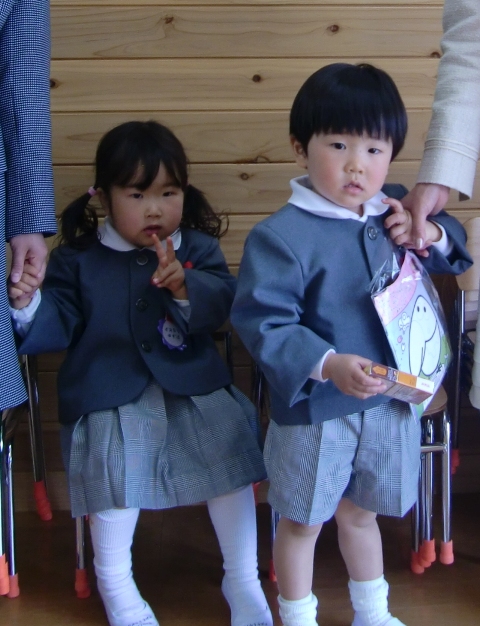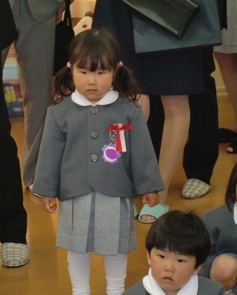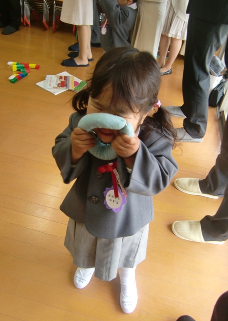 遊戯室に行って式典。マコと手をつないで入場しました。ゆずずの入場のときは線路は続くよ~の歌が流れていましたが、最初は犬のおまわりさんだったらしい…。♪迷子の迷子の~ってその選曲いいのかしら…(笑)