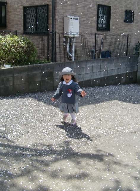 帰宅後家の近くの桜の下で。桜吹雪を楽しんでいました。