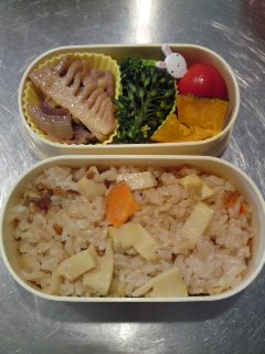 この日はご近所さんから、旬のたけのこをいただいたので、たけのこが多いかな・・・。ミニトマトはいつもは2つ入れますが、幼稚園の緊張もあって少し咳が出ているので、体を冷やすトマトは1つに。代わりに気を補ってくれるかぼちゃを多めにしました。
