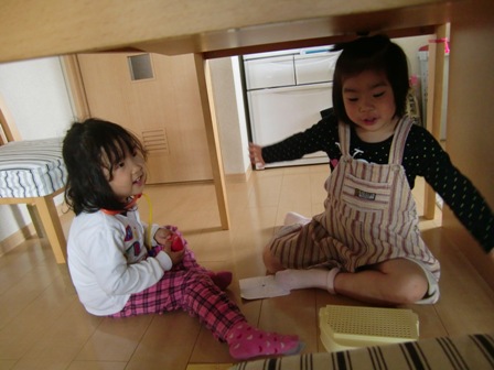ひよりちゃんとなぜかテーブルの下でおうちごっこ。お医者さんごっこもここでしていました^^