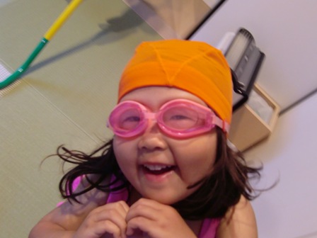 去年の水着、入るだろうか…と思って、ゆずずに着てもらいました。(ゴーグルは使いませんが…ちょっと雰囲気出してみました^^)