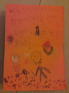 『おとうさんへ いつもおかねかせいできてありがとう。がんばってるね!(ハートハート)なつやすみになったらすいかたべようね(ハート)』でした。