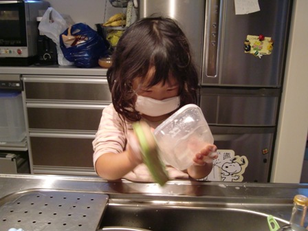 今日は皿洗いをさせてみました。何気にはまったようで、たくさんあらってくれました♪ラッキー♪ちょっと風邪気味で、お料理中はマスクしてました^^