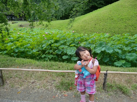見どころのハスの花の前でパシャリ。ハスのポーズをしてるの~?と撮りながら聞いたら、近くにいた外国人のツボにはまったらしく、笑っていました。
