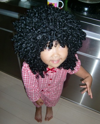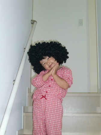 ロッキー(お父さん)の余興用のヅラを洗濯して干してあるのを、隣りの部屋から拝借してきたようです。