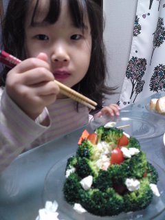 もみの木に見立てたサラダを食べるゆずず。なかはポテトサラダです^^
