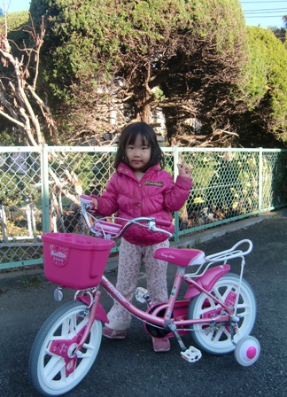 とにかくピンクがいいそうで、(しかも薄ピンクじゃだめらしい^^;)近場の自転車屋で即決め。14インチで、足のつま先がちょうどつくくらいでいい感じ。