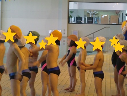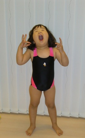 もぐったあと、プールの端まで歩いて行って、そこからカニさん歩きでプールの端を伝って元の場所に戻るようだったのですが、カニさん歩き~と先生に言われて、指をチョキにしながら伝って歩いていて、先生が爆笑してました…(汗)そこはカニじゃなくていいのに…。