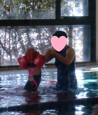 腕に浮き輪をして、先生といったん水にもぐってから、水面に出る練習のよう。鼻に入って泣いていたようでしたが、2回目は平気でした。