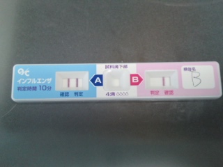 検査結果が出るまで先生は別の患者さんを診ていたのですが。みるまに線が…!くっきりインフルA型の判定に!!(これは記念にもらってきました…(笑))