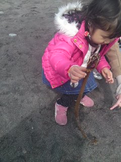 ちょっとフレームアウトしちゃいましたが、浜辺にうちあげられたわかめを持つゆずず。