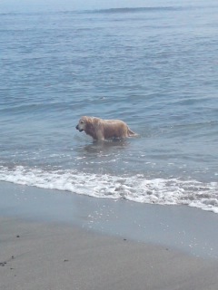大きいゴールデンレトリバーが思いっきり泳いで遊んでいました。