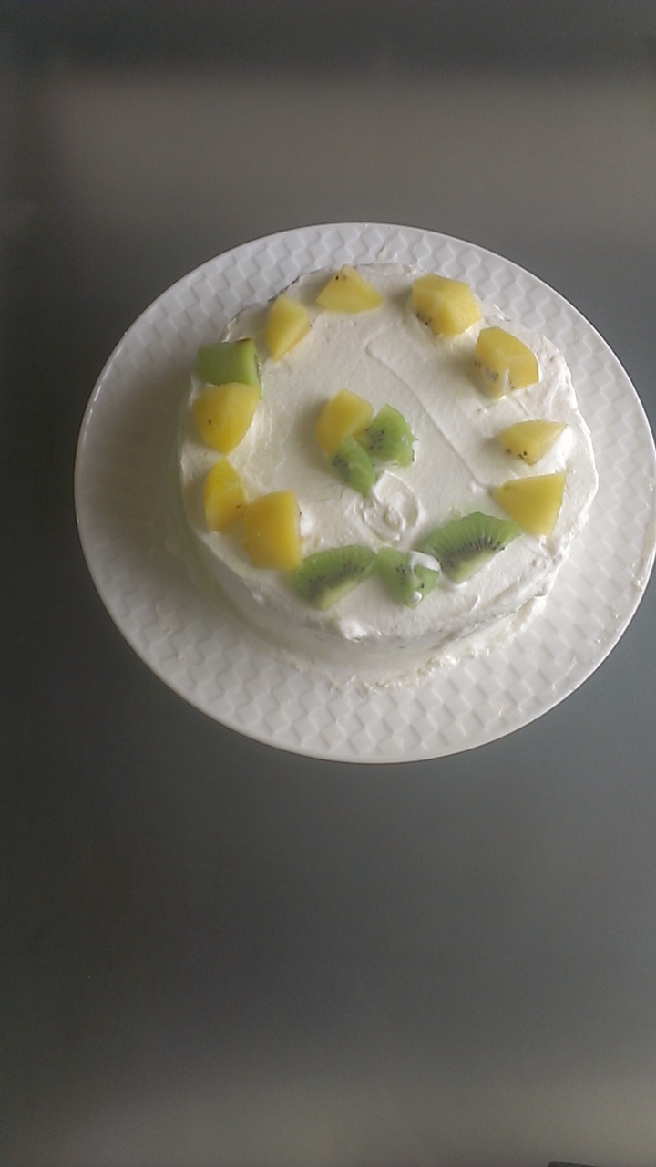 ゆずず作のデコレート。いちごはシーズンオフなので、キウイで代用。2個使いましたが、思いのほか足りなくなってしまって、ちょっと寂しい感じ・・・。