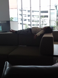 お店から場所を変えて、友人のマンションへ。ラウンジのソファーの背もたれに横たわるゆずず・・・(☼Д☼)||| なんてお行儀の悪い・・・そしてお、お腹が盛り上がってる!