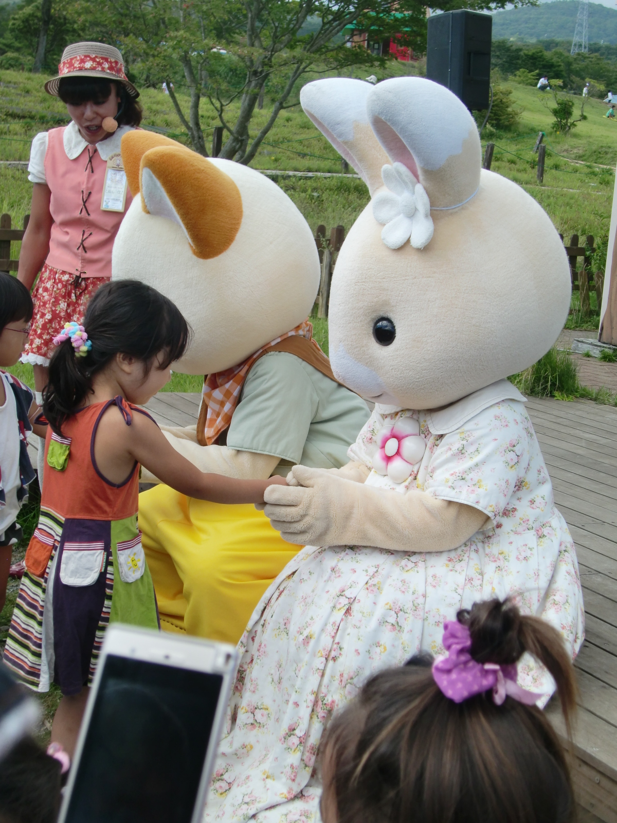 シルバニアビレッジのショーで、うさぎさんと握手。ショーはあんまり乗り気じゃなかったかなぁ。なんていうかシルバニア=お人形で遊ぶってイメージだったようで、最初からシルバニアは~?と連呼・・・(^_^;)乗り物とかも全体的にもう少し小さい子向けかも。