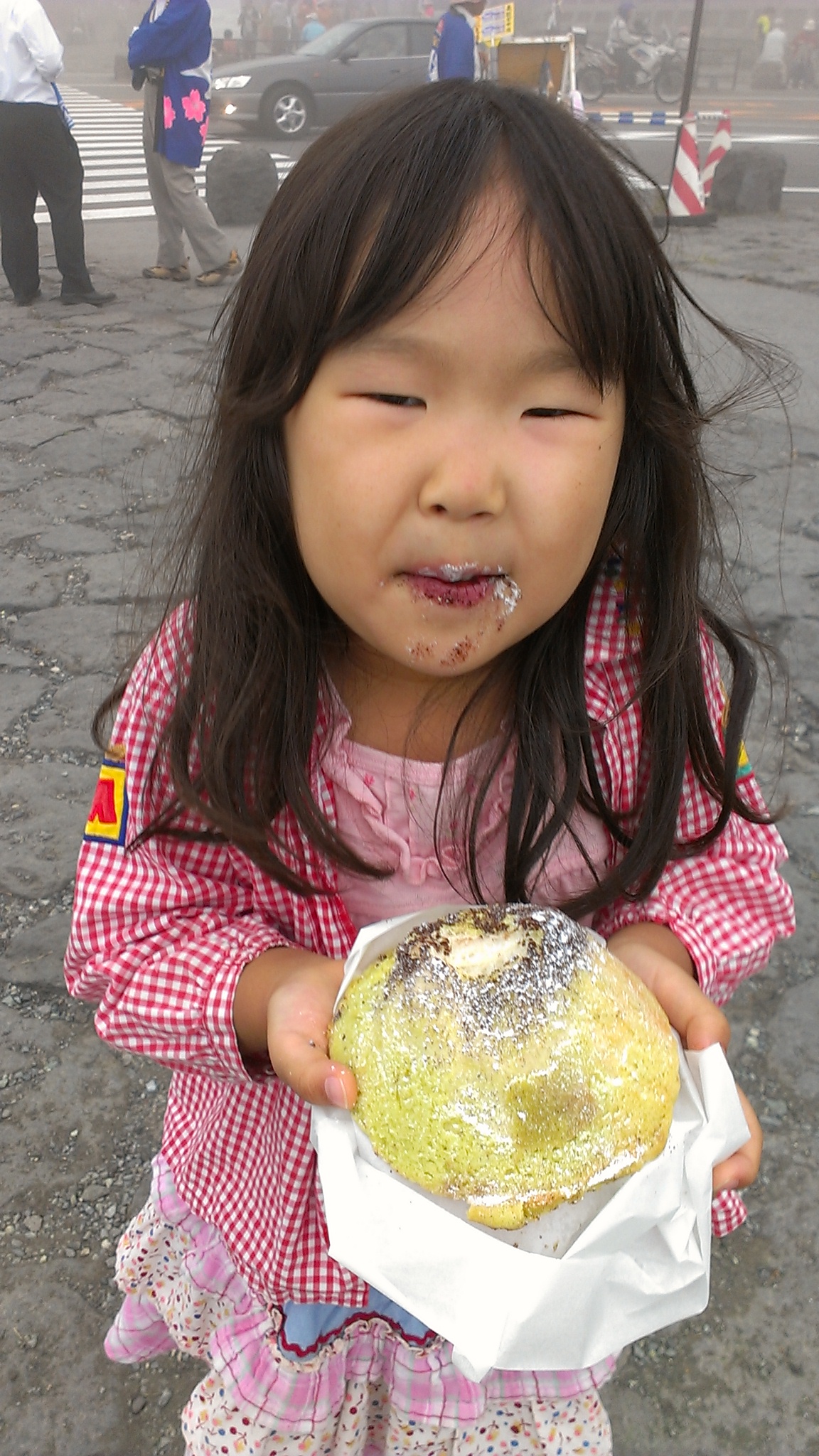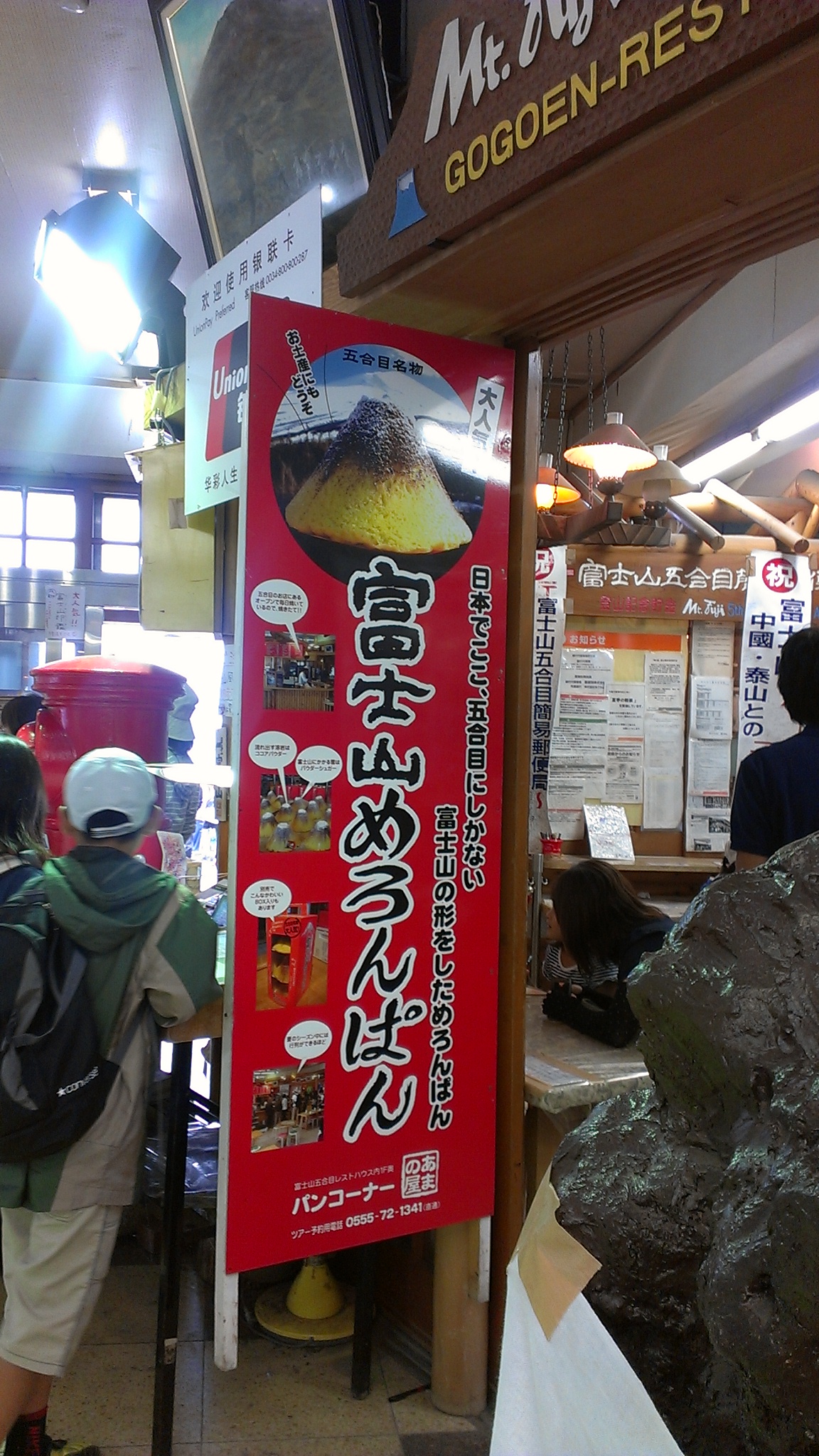 富士山5合目メロンパン、ここでしか食べられないそう!売り切れだったのにご飯食べたり、おみやげみたりして帰る頃に焼きあがることに。ゆずずがどうしても食べたいと言うので並んで待つこと40分・・・。