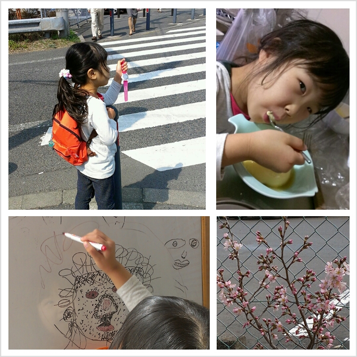 日曜日、午前中にお母さんの変な顔(左下)を描いた後、一人でおつかいに行ってもらいました。
