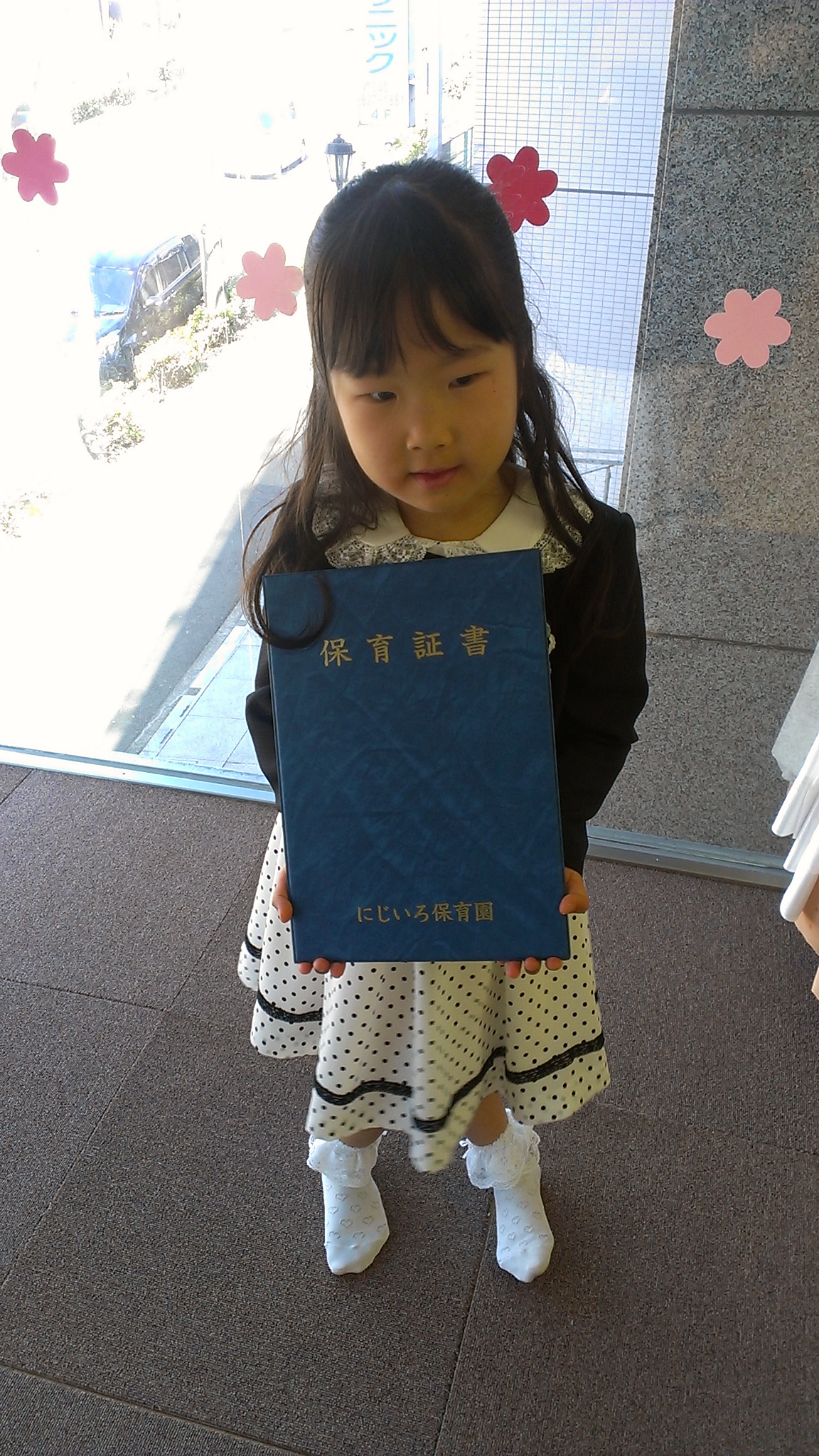 保育証書を一人ずつ渡されるのですがちゃんと片手ずつつかみ、脇に抱えて礼、そのあとみんなの方を振り返り、片手をあげて、「私は将来お菓子のコックさんになりたいです!」と夢を宣言。