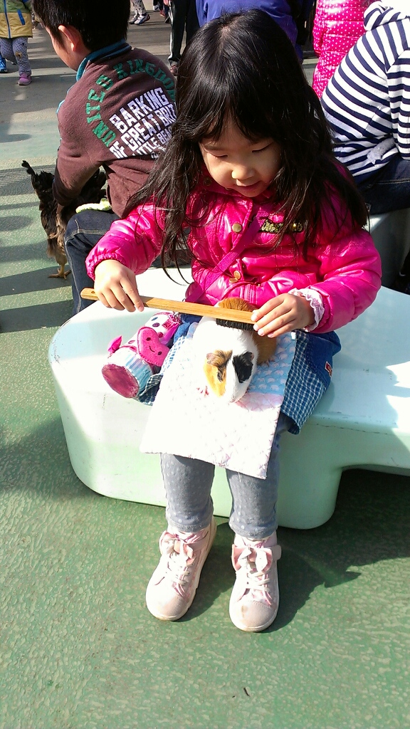 最初に動物ふれあいコーナーへいき、モルチャンにブラッシング。